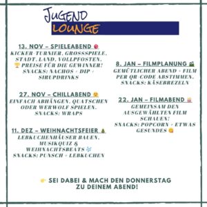Nach einer etwas längeren kreativen Pause laden wir zu den nächsten Veranstaltungen der Jugend Lounge ein.